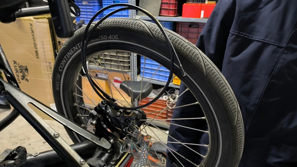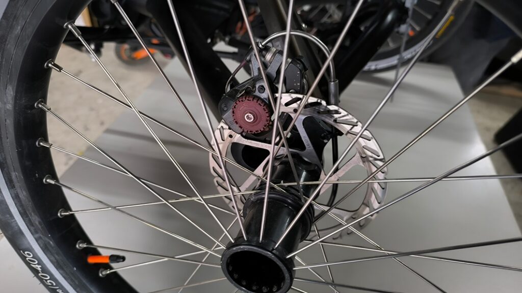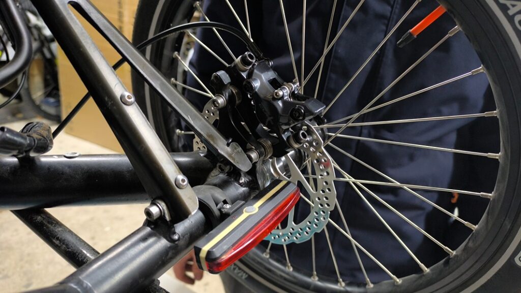 Hátul is szépen lekötegeltük a fékcsövet és beállítottuk a féknyerget a féktárcsához.