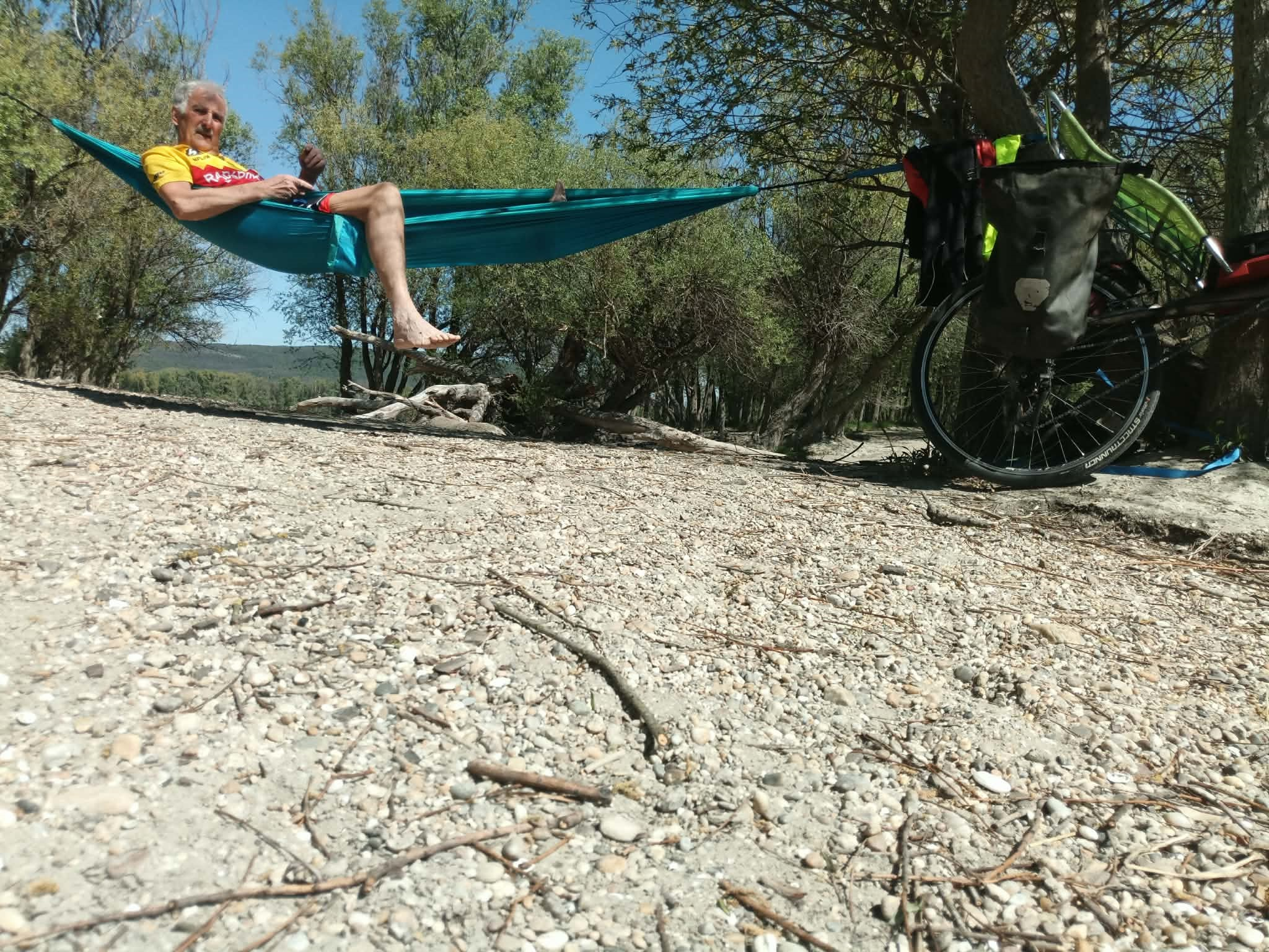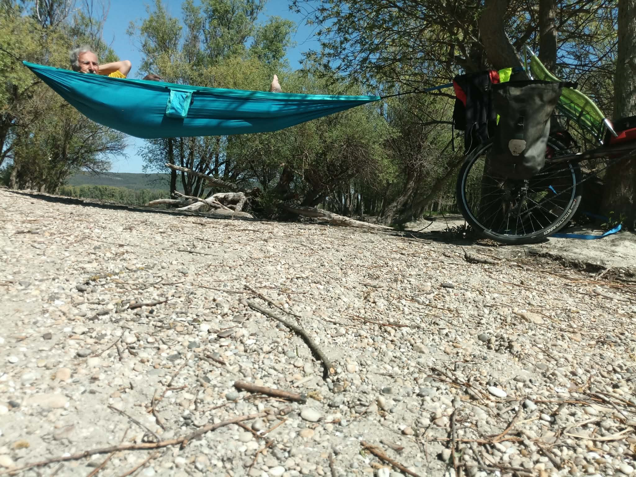 Kifeszítve a függőágyam a ragyogó napsütésben megkezdtem az ejtőzést. Időmet az ebédem elfogyasztása után napozással, olvasással és zene hallgatással töltöttem. Ja, meg némi szunyókálással. Három és fél órát töltöttem lazítással a nap sugarainak élvezésével. Nem kell mindig 150-160 kilométert tekerni kell néha egy kis lazulás.
